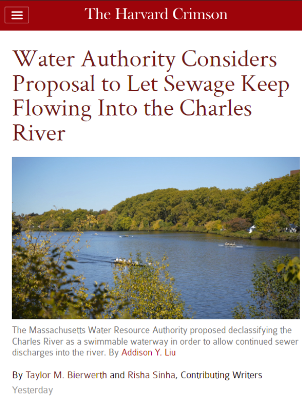Update Mar. 9, 2026: The Crimson publishes “Environmental Groups Push Back on MWRA Plan Allowing Sewage Overflows Into Charles“.