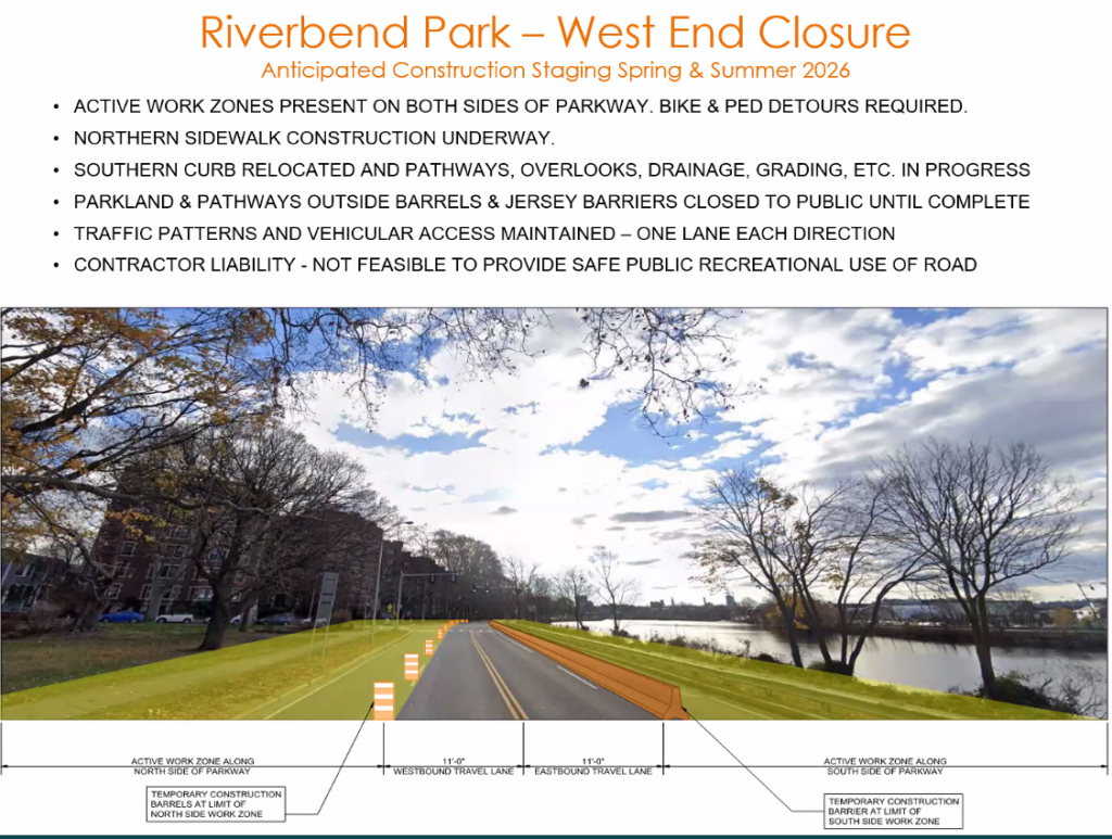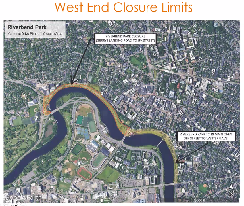 WEST END CLOSURE: Due to ongoing construction associated with the Memorial Drive Greenway Improvements, Phase III project, Riverbend Park will be temporarily modified throughout the 2026 season. Memorial Drive is closed to vehicular traffic from 11am to 7pm, from JFK Street to Western Ave ONLY. The seasonal dates and times of Riverbend Park remain consistent. Due to safety and logistical considerations applicable to active work zones, Riverbend Park will not be operating from Gerry’s Landing Road to JFK Street in 2026; traffic patterns (and cars) will continue on this narrow stretch. (Click images to enlarge detail.)