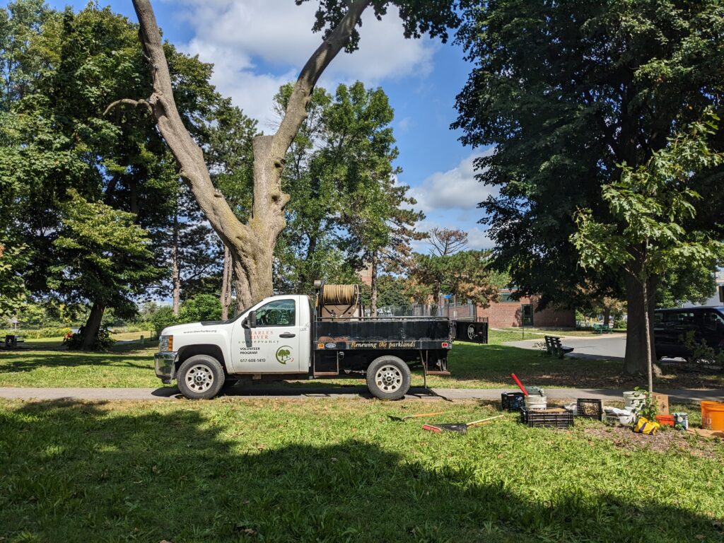 Magazine Beach is a 15-acre park in Cambridge, featuring an historic granite “Powder House,” which was built in 1818 as a state gunpowder magazine. The building was redeveloped in 1899 by Olmsted & Eliot, as a bathhouse to accommodate a lively swimming scene at Magazine Beach. As a result of industrialization, poor water quality and contaminated sediments resulted in the closure of the public beach in 1955. Today, the park features a large treated swimming pool, playing fields, picnic areas, pathways, and large swaths of open space to accommodate crowds for events such as the Head of the Charles Regatta, held annually in October. To learn more about work being done at Magazine Beach, visit the Magazine Beach Partner’s blog. The Conservancy regularly hosts volunteer events at Magazine Beach.