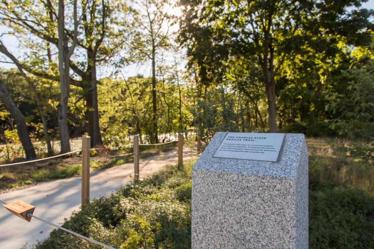 Watertown Riverfront Park is nestled along Charles River Road in Watertown, between Perkins School for the Blind and the Galen Street Bridge. This mile-long stretch includes walking and biking paths, gorgeous river outlooks and open green space, plus a playground with a basketball court. On the western (upstream) end of the park is the “Braille Trail”, a unique and amazing quarter-mile walking loop designed to be enjoyed by blind and low-sighted individuals. Guiding wires help users stay on the trail, and differently shaped beads indicate park features, many of which have interpretive signs that can be read in braille. The center of the trail includes a sensory garden with fragrant plants, interesting textures, and other tactile or sonic elements including boat- and marimba-shaped benches and a braille engraving of poetry. The Braille Trail, and the broader Watertown Riverfront Park, are the culmination of sustained advocacy and partnerships between DCR, the Solomon Foundation, Sasaki, Perkins School for the Blind, and local community advocates.